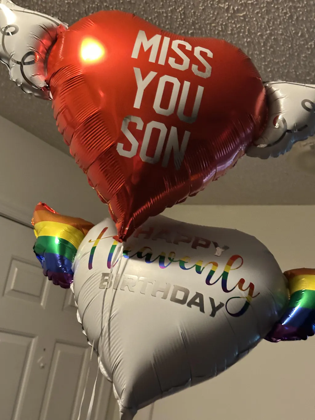 2 x Colorful heart-shaped Happy Heavenly Birthday memorial balloon with rainbow angel wings